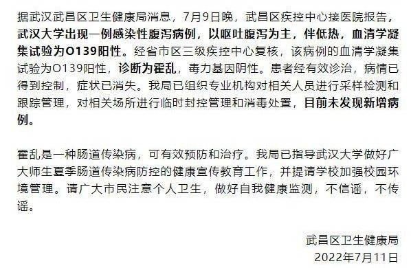 On the evening of July 9, wuchang District CENTER for Disease Control and Prevention reported a case of infectious diarrhea in Wuhan University, mainly vomiting and diarrhea accompanied by low fever, which was diagnosed as cholera. No new cases have been found after professional follow-up tests and disinfection treatment.