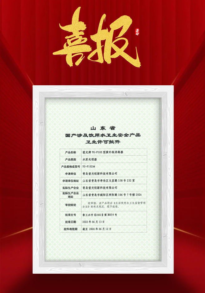 "Yingguang yg-f102 ultraviolet sterilizer" was strictly reviewed and tested by the provincial and Municipal Health Commission departments, and has successfully passed all the approval processes, and successfully obtained the approval document for hygiene license of domestic products involving drinking water hygiene and safety in Shandong Province.