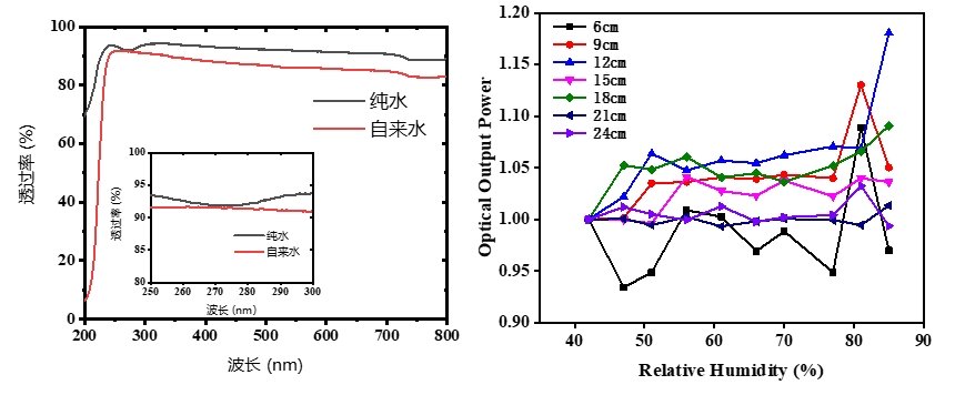 Pure water and tap water show good transmission characteristics to light with wavelength between 250 ~ 800 nm. The transmittance of 5mm thickness is more than 80%. When the wavelength is shorter than 250 nm, the optical absorptivity increases rapidly. Especially tap water has stronger light absorption of < 250 nm. 2.4cm attenuation to 70%; 8.5cm attenuation to 30%; 16.3cm attenuation to 10%.