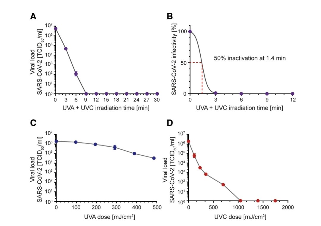Researchers have done some research on the time of UV killing the new crown and the ultraviolet lamp has been used to irradiate COVID-19 samples. As shown in the following picture, all the COVID-19 can be killed by mixing the ultraviolet rays of two bands (UVA+UVC) for 9 minutes. 50% of the viruses can be inactivated after 1.4 minutes of mixed ultraviolet irradiation of the two bands. UVA exposure alone had a poor effect on virus inactivation. After 9 minutes of irradiation, the emission dose was 292 MJ / cm2, and a log reduction in virus load was observed. In contrast, the virus was completely inactivated after exposure to UVC for 9 minutes and the emitted UVC dose was 1048 MJ / cm2. These data confirm the previous findings that UVC is more effective in inactivating viruses, and emphasize that UVC radiation is an effective method to inactivate new crowns.